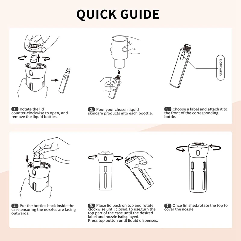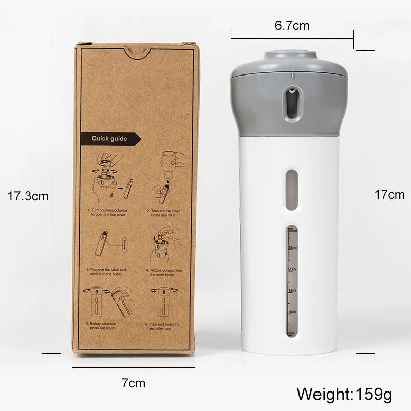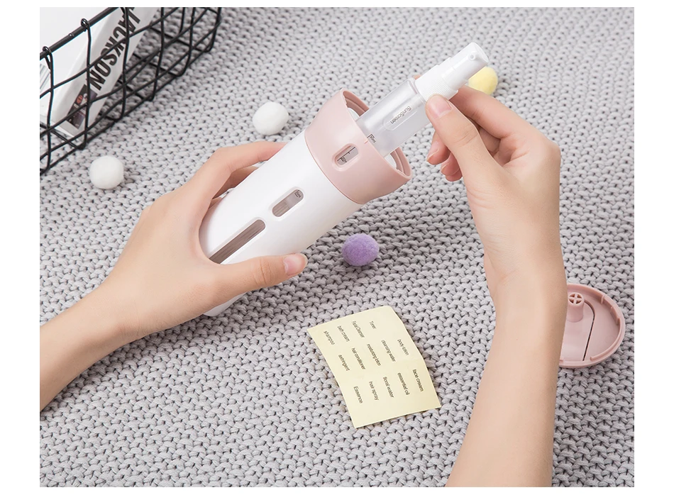 Switch between each bottle by simply rotating the top and just a single press to spray. Travel Mate 4-In-1 Bottle Set has a lightweight and cute design is easy to fill and dispense, very handy.