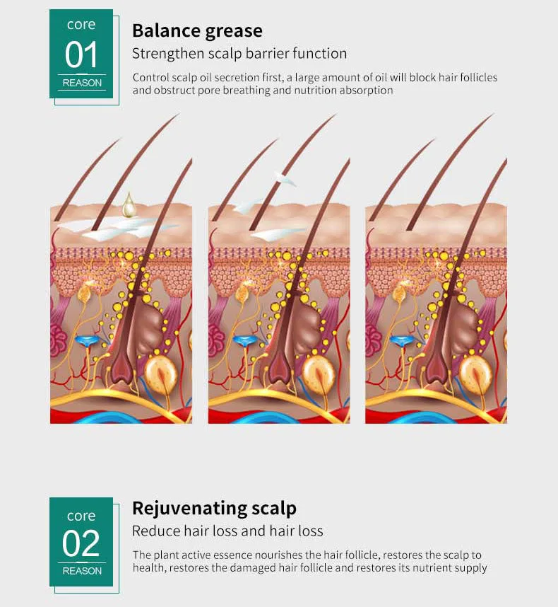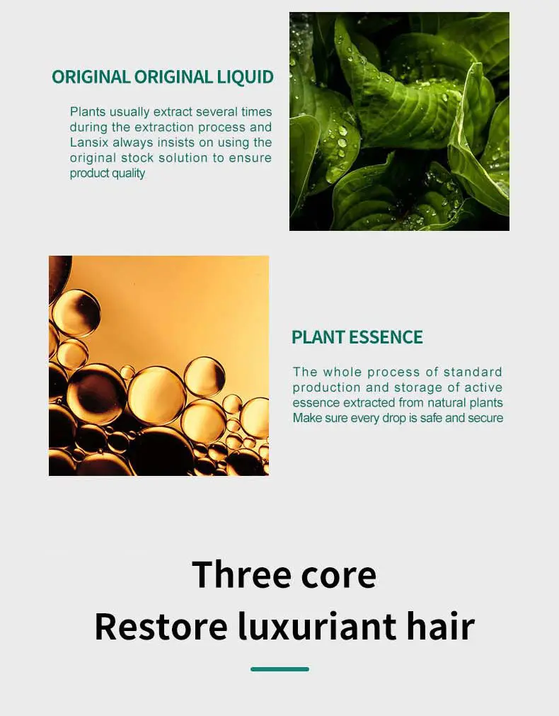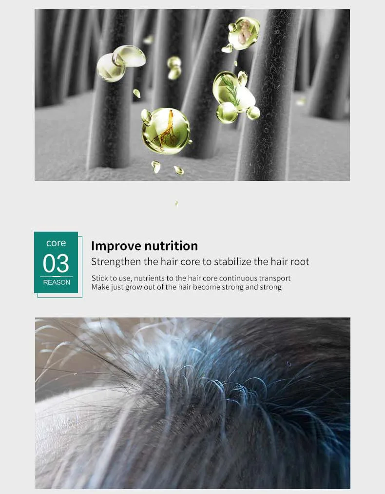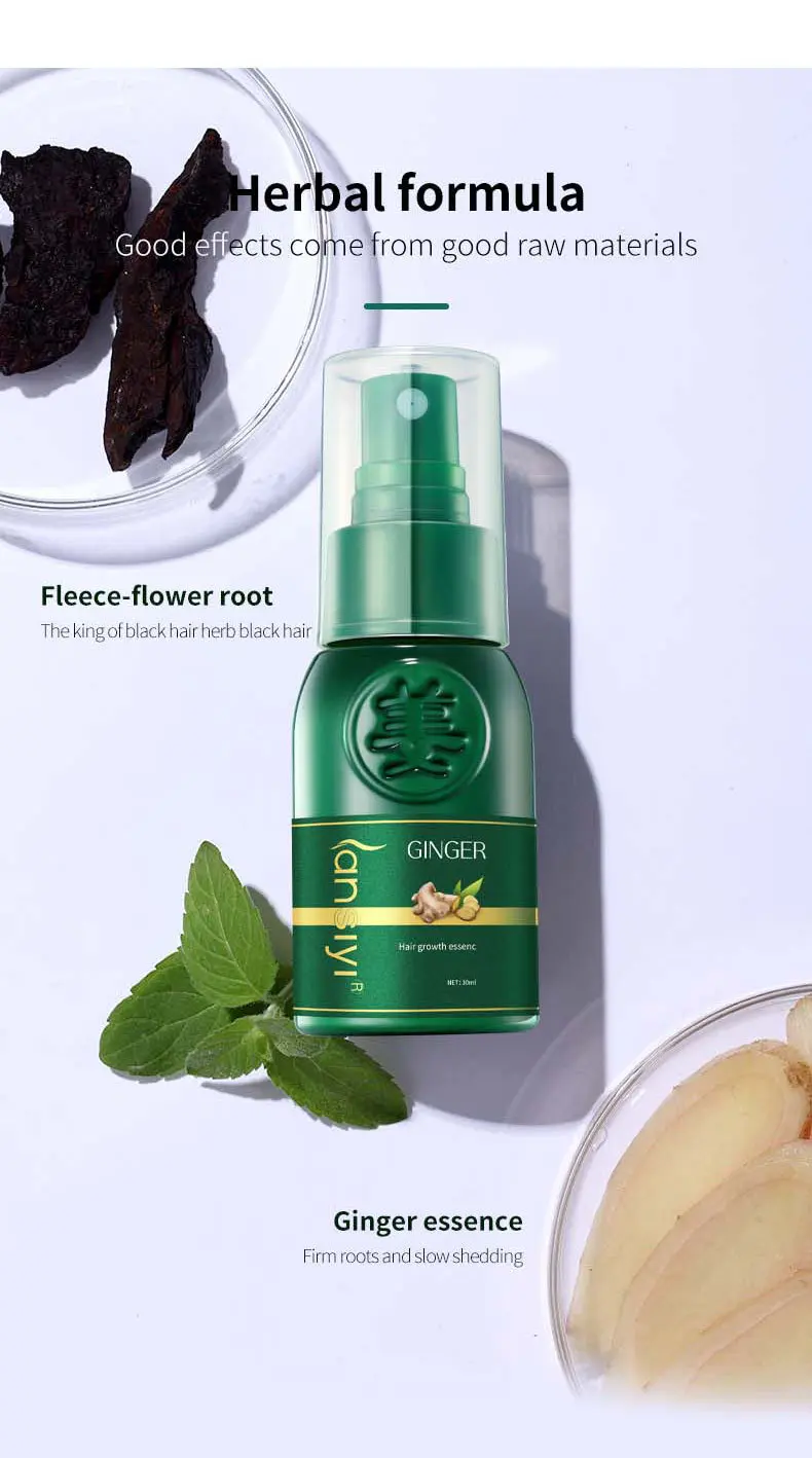 100% Natural Ingredients: Ginger, ginseng, polygonum multiflorum, and grape seed oil, those can effectively prevent hair loss by delivering nutrition to hair root, repair damaged hair, restore the vitality of hair