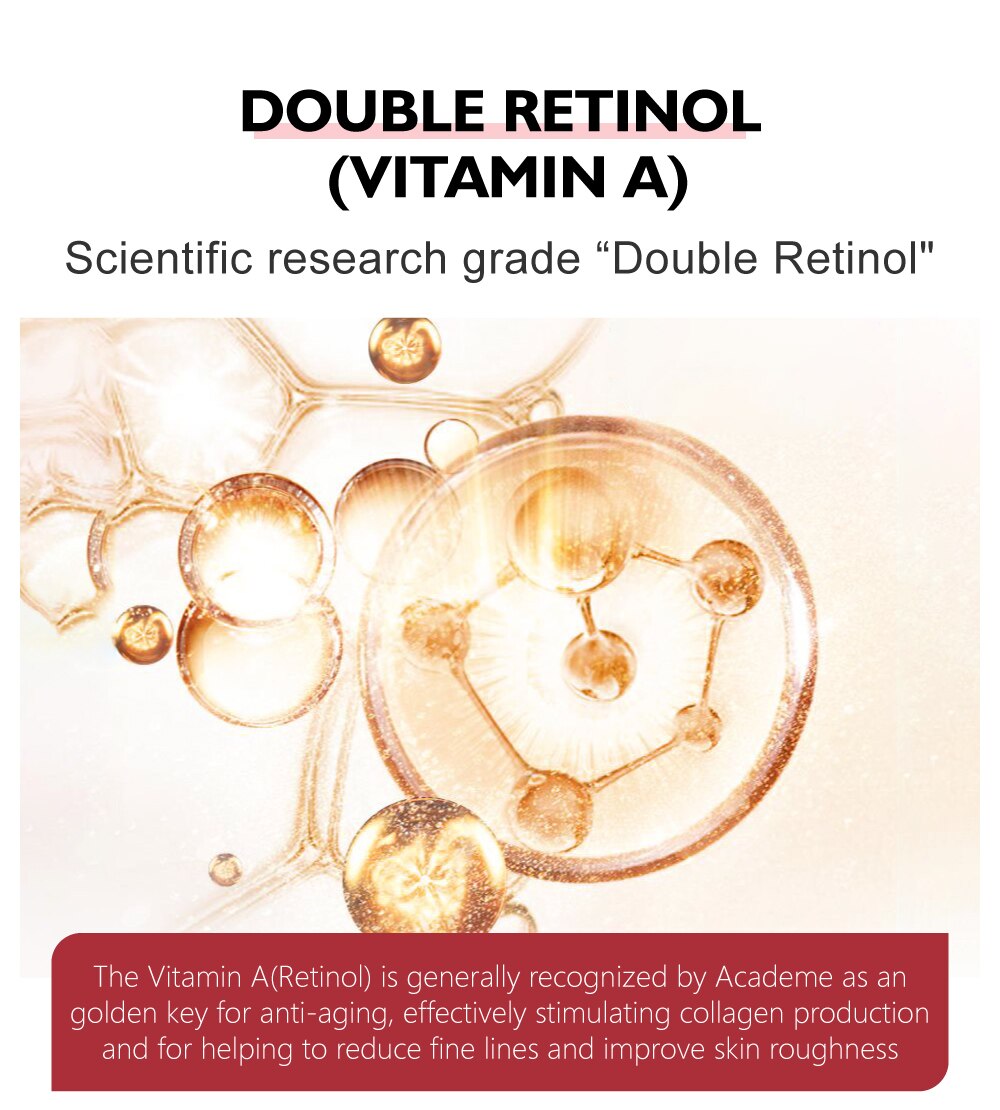 Laboratory studies have shown that: Double Retinol(Vitamin A)+Vitamin C + Acetyl Hexapeptide-8+Arbutin,strength of anti-wrinkle fade wrinkles, brighten the skin tone