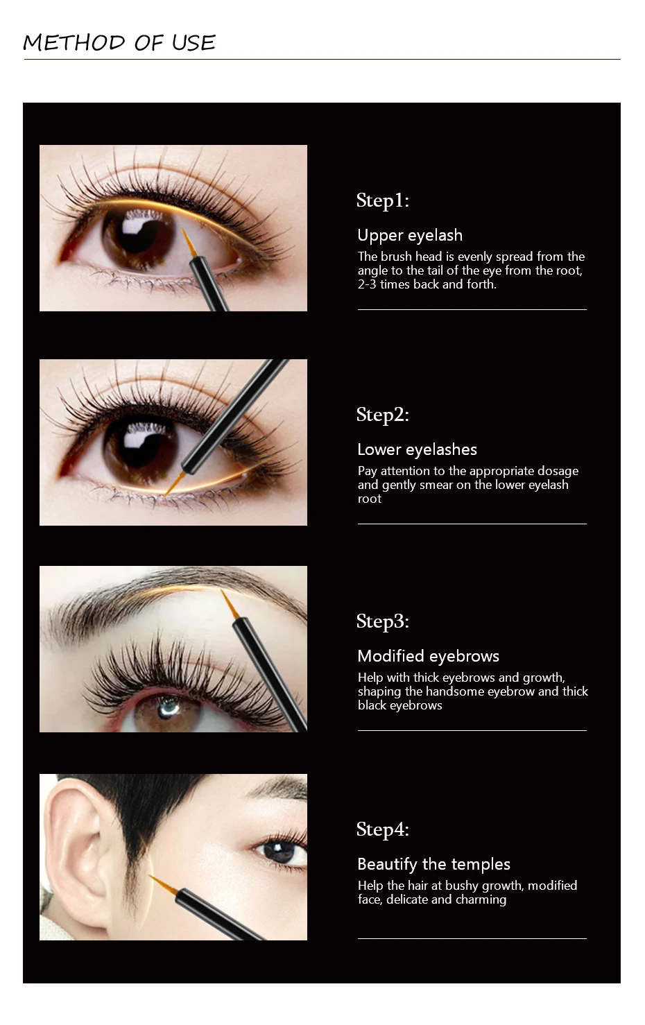 It is simple and easy to apply and is hypoallergenic and completely safe and effective. Apply to the base of your upper and lower lash line at the root every night as though applying eyeliner. You can also apply a thin line to your clean eyebrows for thicker brows.