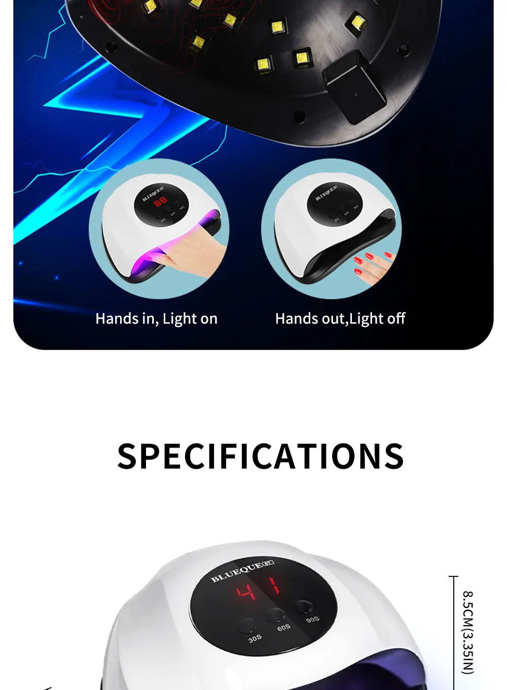 • Pure Convenience: Simply place your hand inside the curing chamber, and the lamp automatically turns on, beginning its timed cycle. Remove your hand, and it turns off. This not only provides a seamless, mess-free experience but also conserves energy and extends the life of the bulbs.