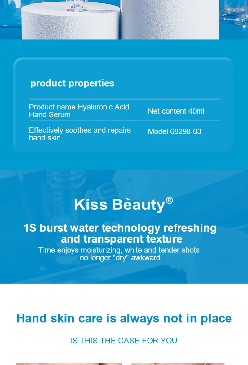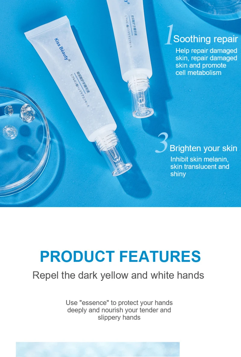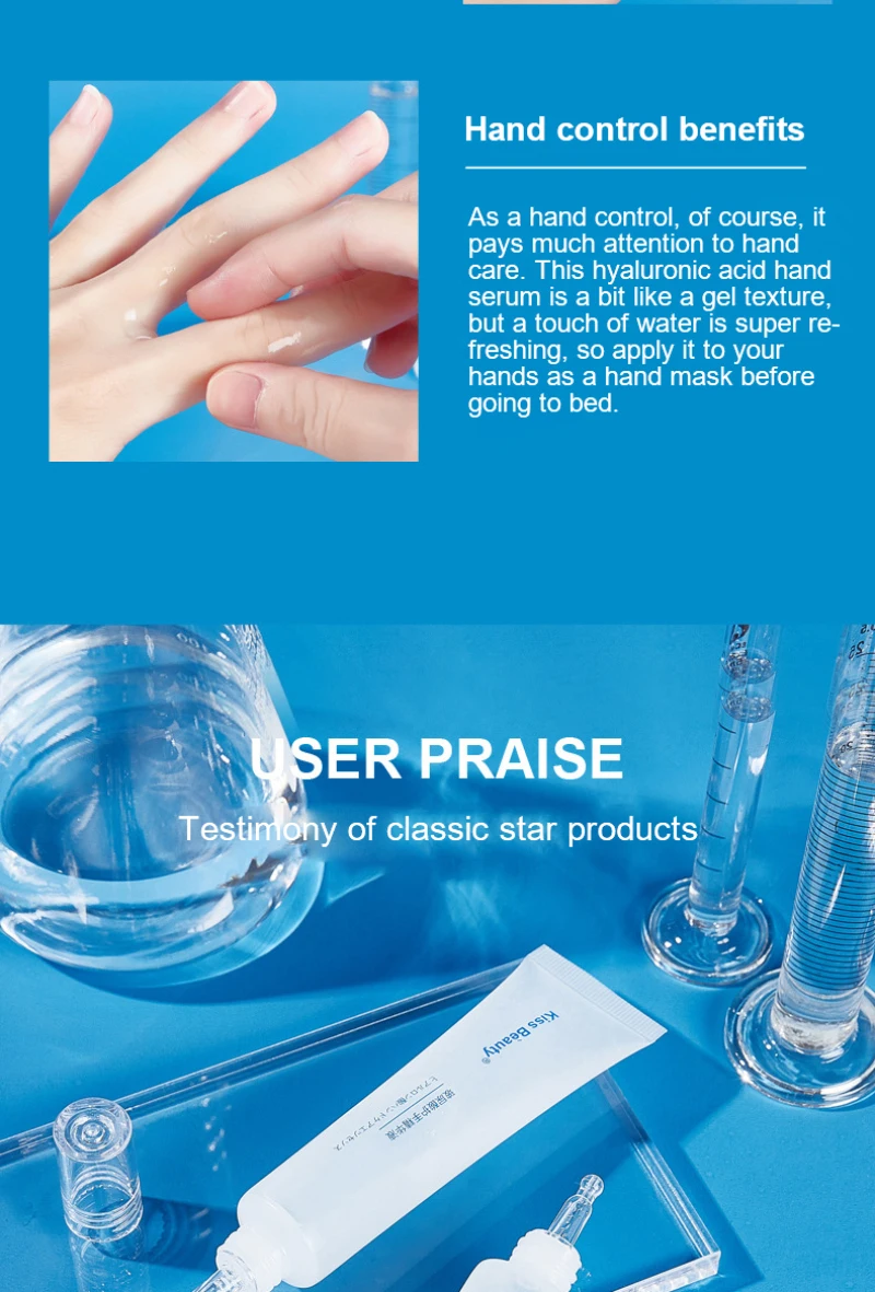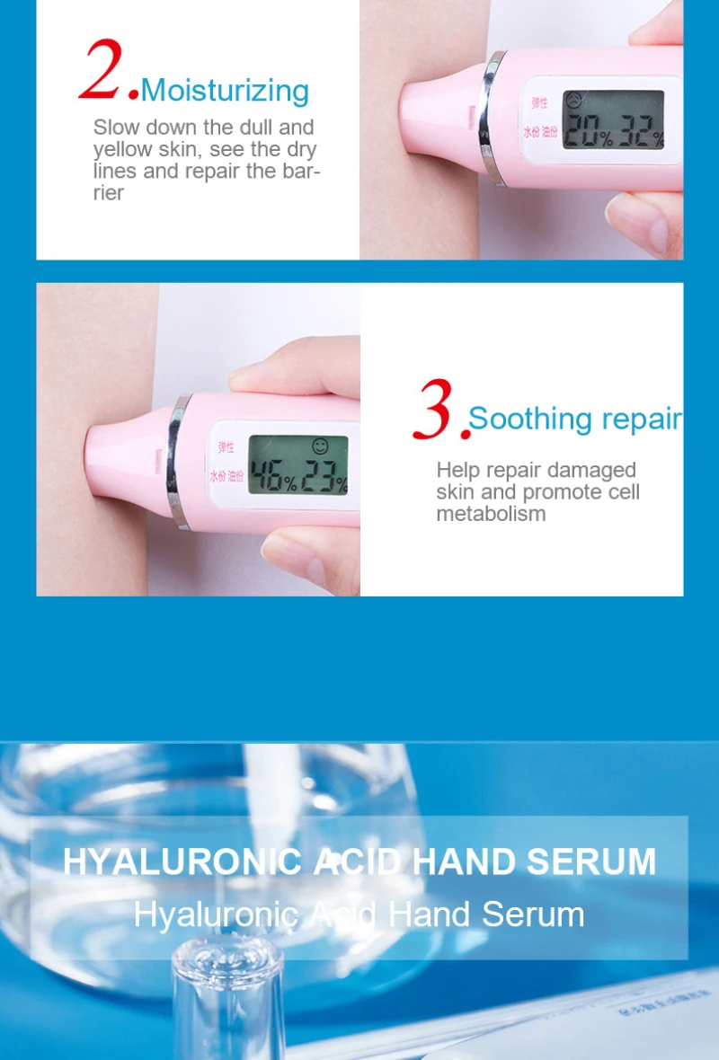 【Instant Results】 Hyaluronic Acid Hand Care Essence instantly boosts skin moisture, soothing formula is fast-acting and non-greasy, and absorbs quickly into your skin, leaving you soft and smooth.