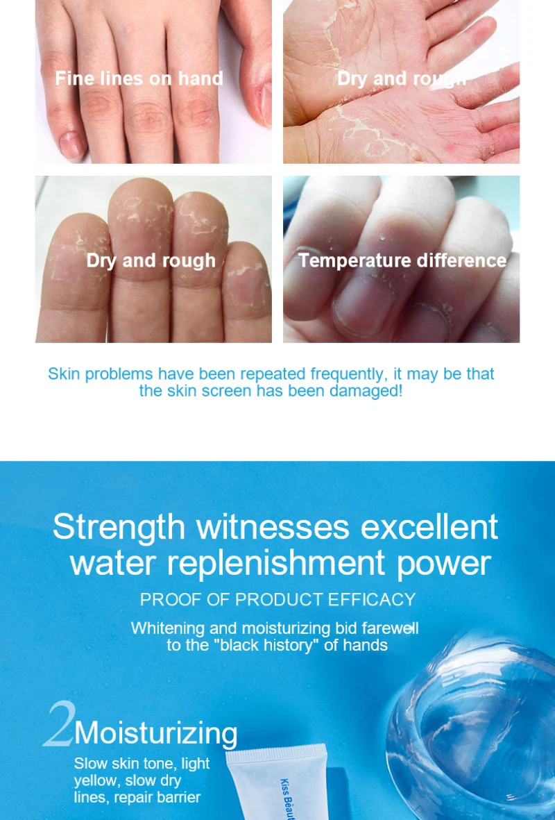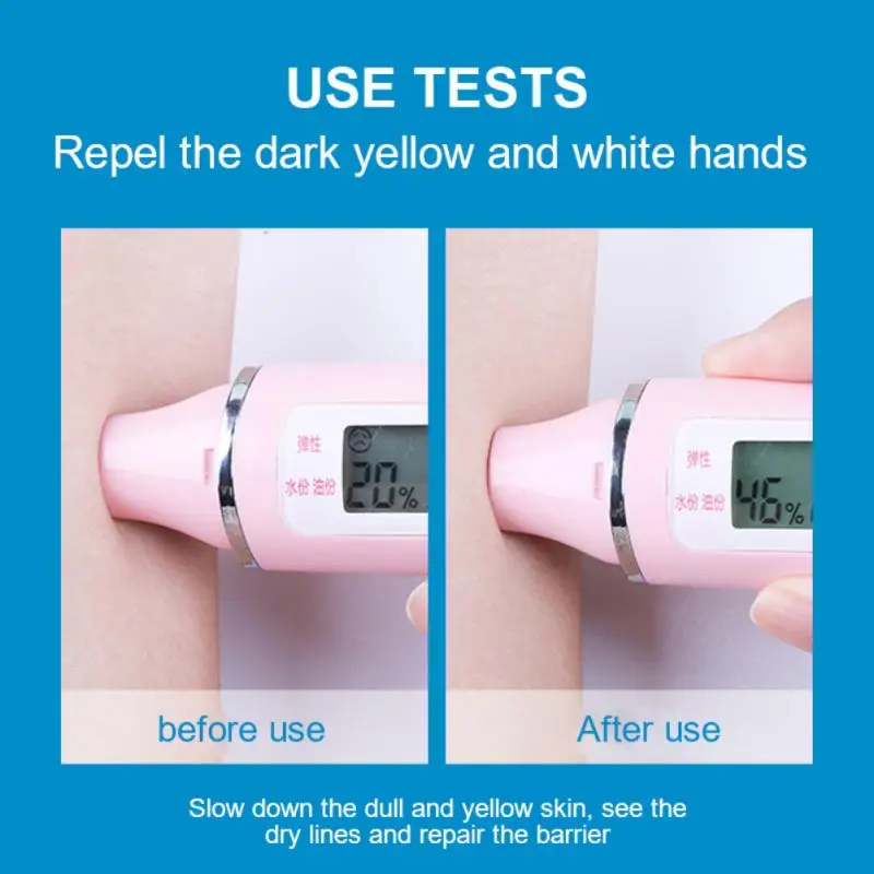 【Suitable for the crowd】 Dry skin, oily skin, mixed oil/mixed dry, neutral, and other skin types. It is aimed at improving the problem of hand skin such as fine lines, dark yellow roughness, dry cracking, barb, and calluses on the hands.