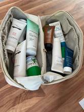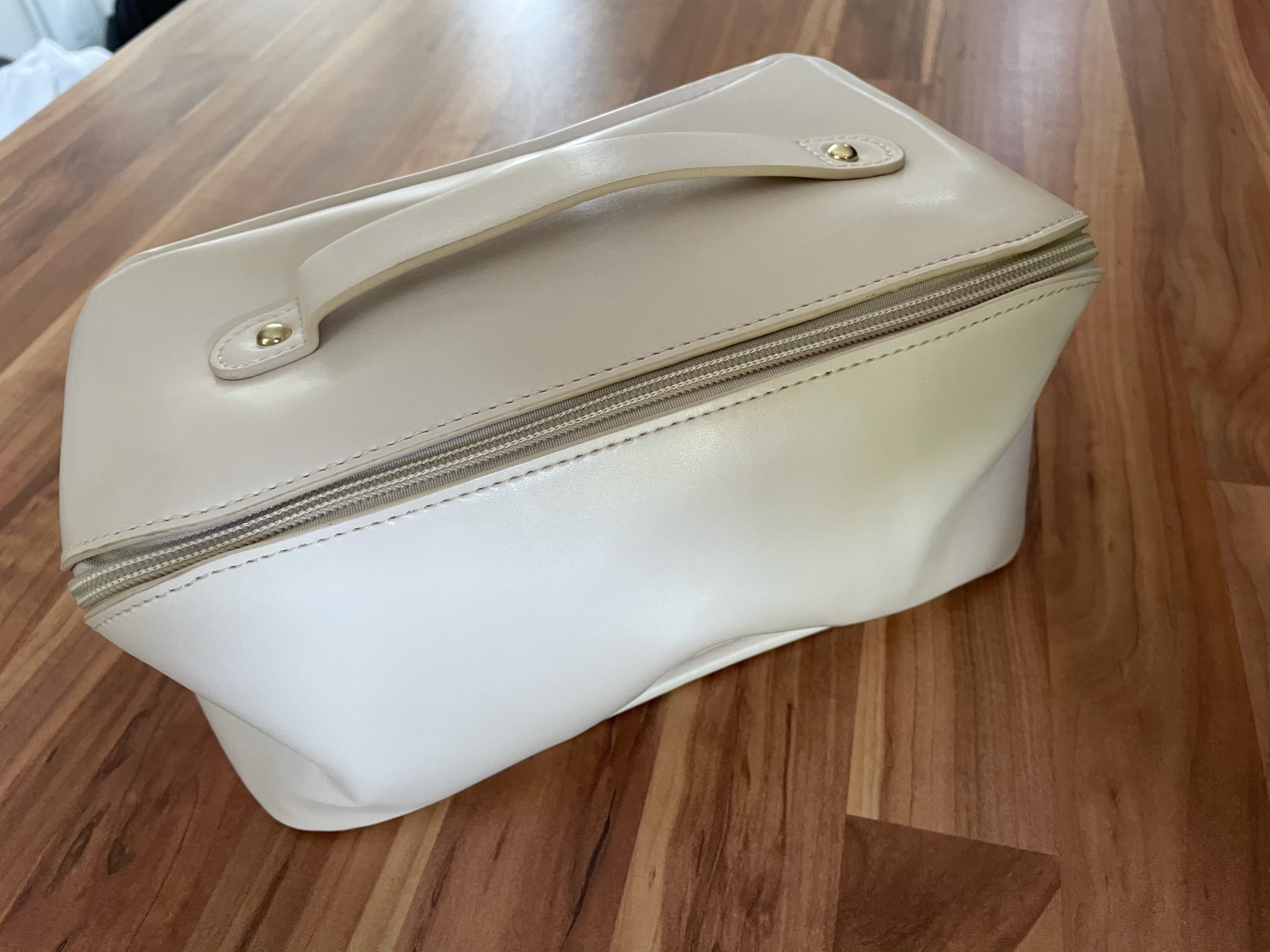 The pouch has a large capacity to put several beauty products. The quality is correct but somewhat fragile. Some traces of fold on the faux leather at the reception and if the kit is not full there may be more. Be careful there is no text inscription as on the pictures.
