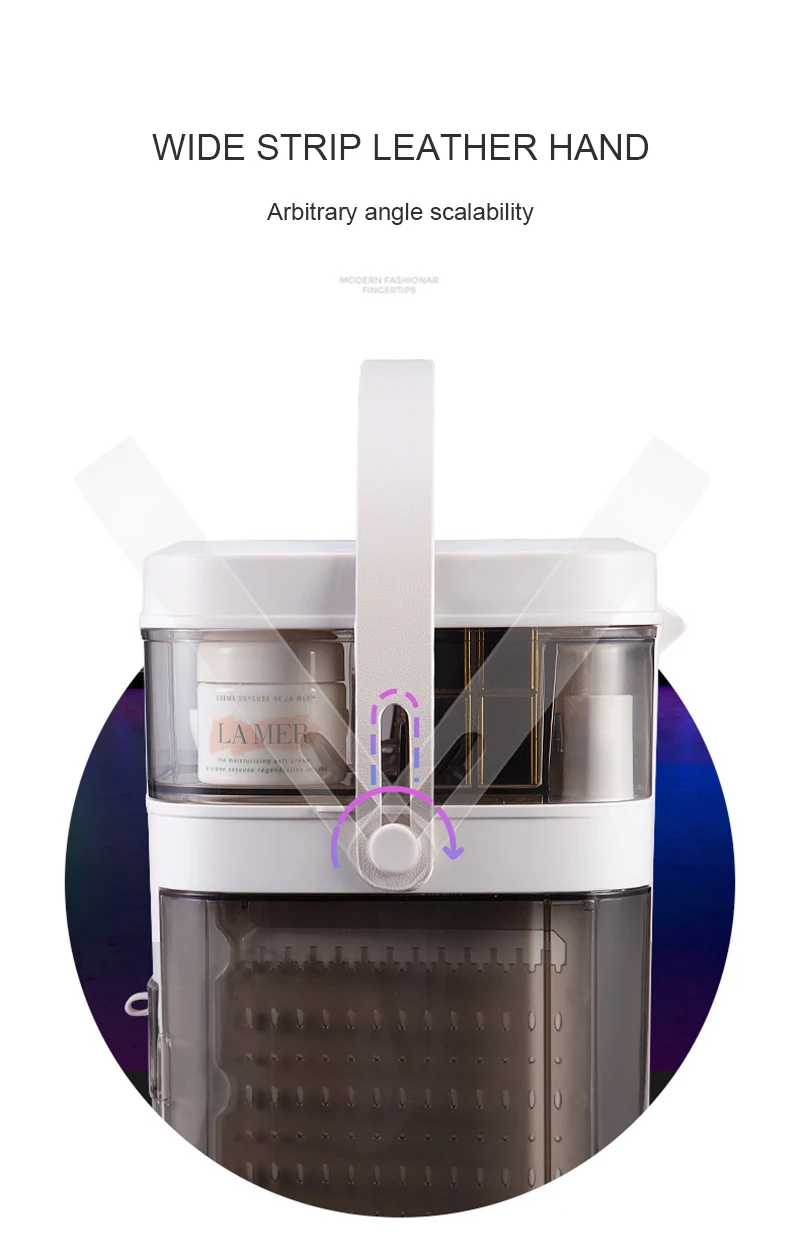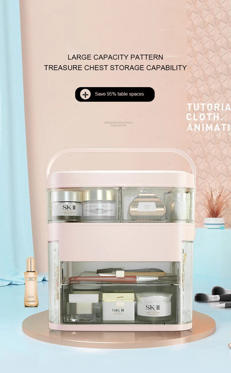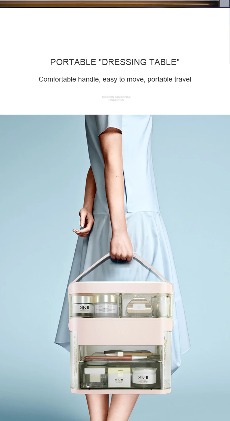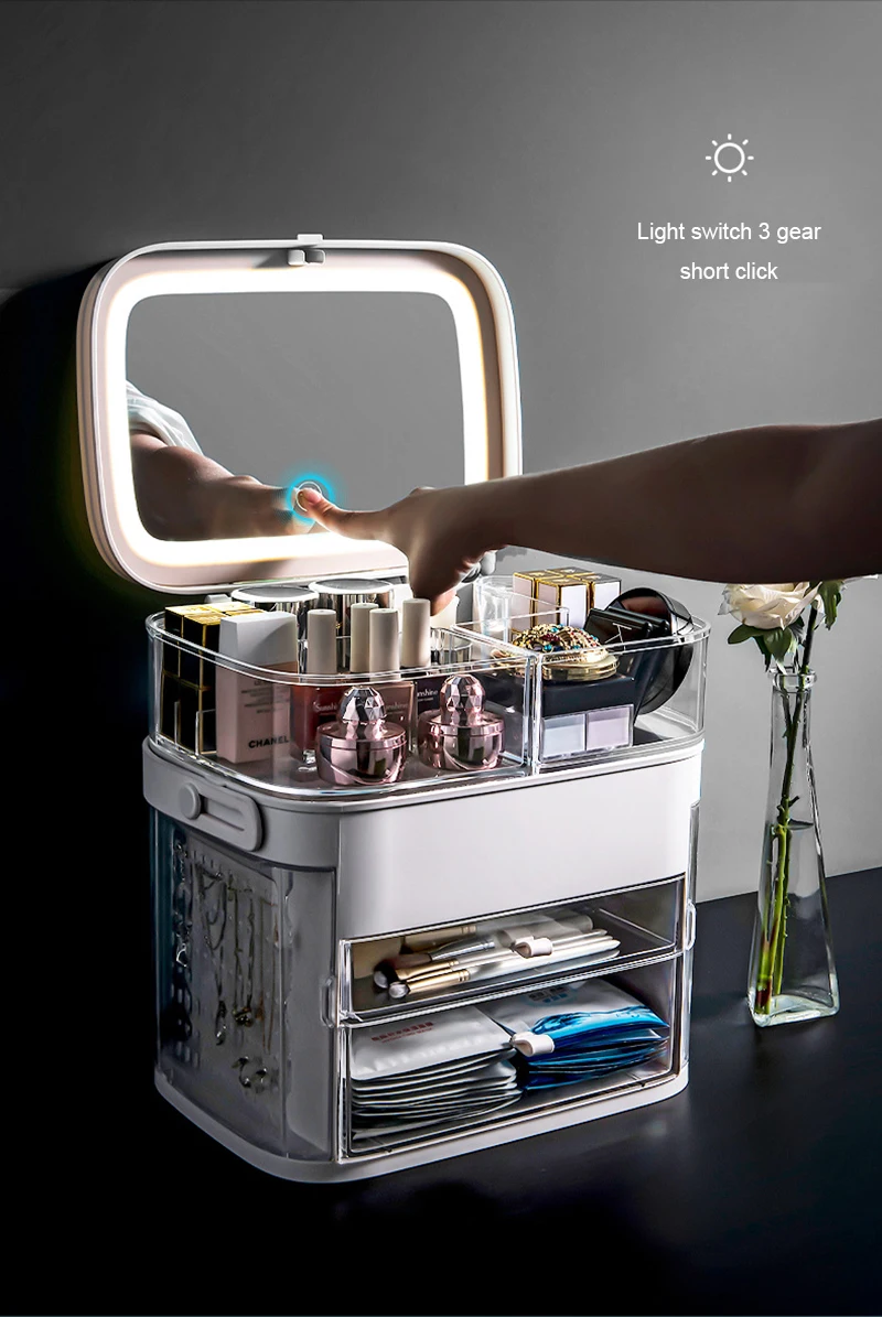Well, not anymore. Introducing the Makeup organizer with mirror that you can take any time anywhere! The rotating design, and the drawers equipped with silicone handles, make it become a fully open and barrier-free highly efficient storage assistant, greatly save your precious time. In addition to that, an HD mirror free to adjust the light according to demand, skincare makeup is easier. The makeup organizer with mirror has good air tightness, so it is dust-proof and waterproof, can be used in washing rooms, bathrooms, bedrooms. It stands out with its stylish, innovative, and neat appearance, bringing elegant charm to every fashionable woman. Buy it now!