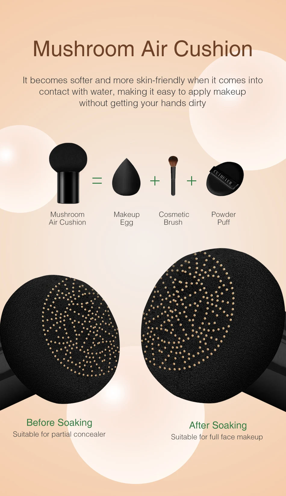 No more cakey & stuffy makeup!The innovative mushroom head sponge makeup brush is designed with unique cutting & holes. Minimum water retention avoids excessive amount of CC cream applied. Great for blending, cleaning up smudges and smoothly even out CC cream.