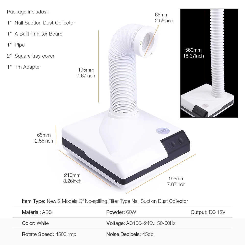 This Nail Dust Collector is a great tool for Nail Salons. It’s stretchable and flexible nail suction pipe makes it so easy to use! It also has 3 LED beads for extra lighting. The anti-gravity suction way means you can work with less distracting noise. Reusable filter, hollow design and high efficiency. Easy heat dissipation.