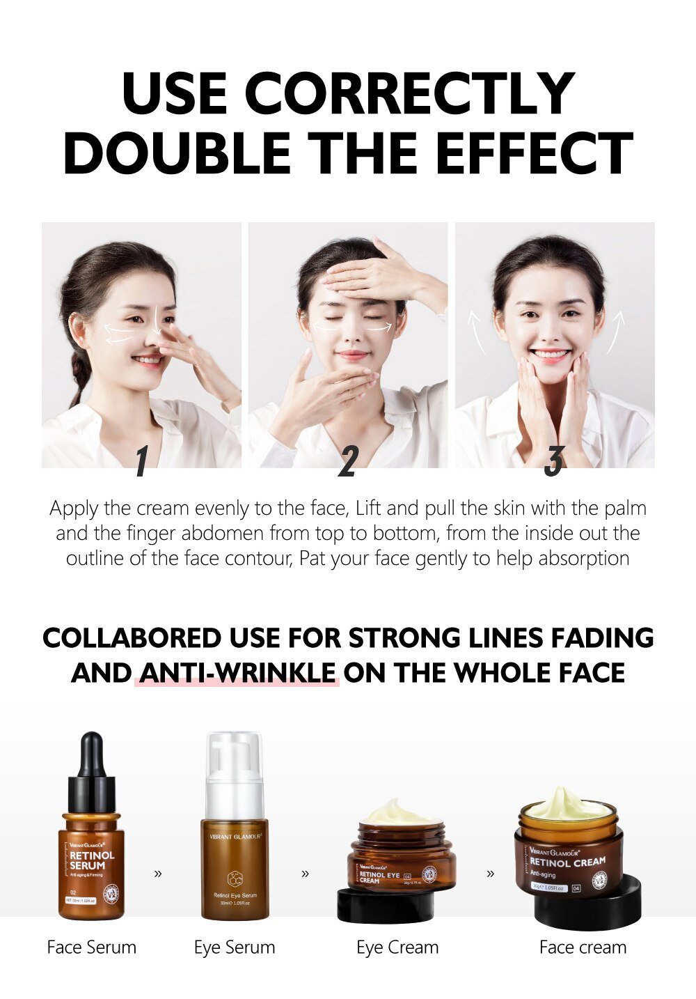 Laboratory studies have shown that: Double Retinol(Vitamin A)+Vitamin C + Acetyl Hexapeptide-8+Arbutin,strength of anti-wrinkle fade wrinkles, brighten the skin tone