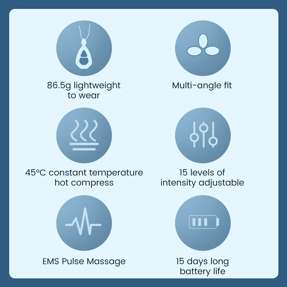 Acupuncture points are stimulated by the EMS Portable Lymphatic Relief Neck Massager, which has a number of health advantages for the body, including pain relief, improved blood circulation, and relaxation. A general massage will be beneficial to your body since it eases weariness and muscular strain.