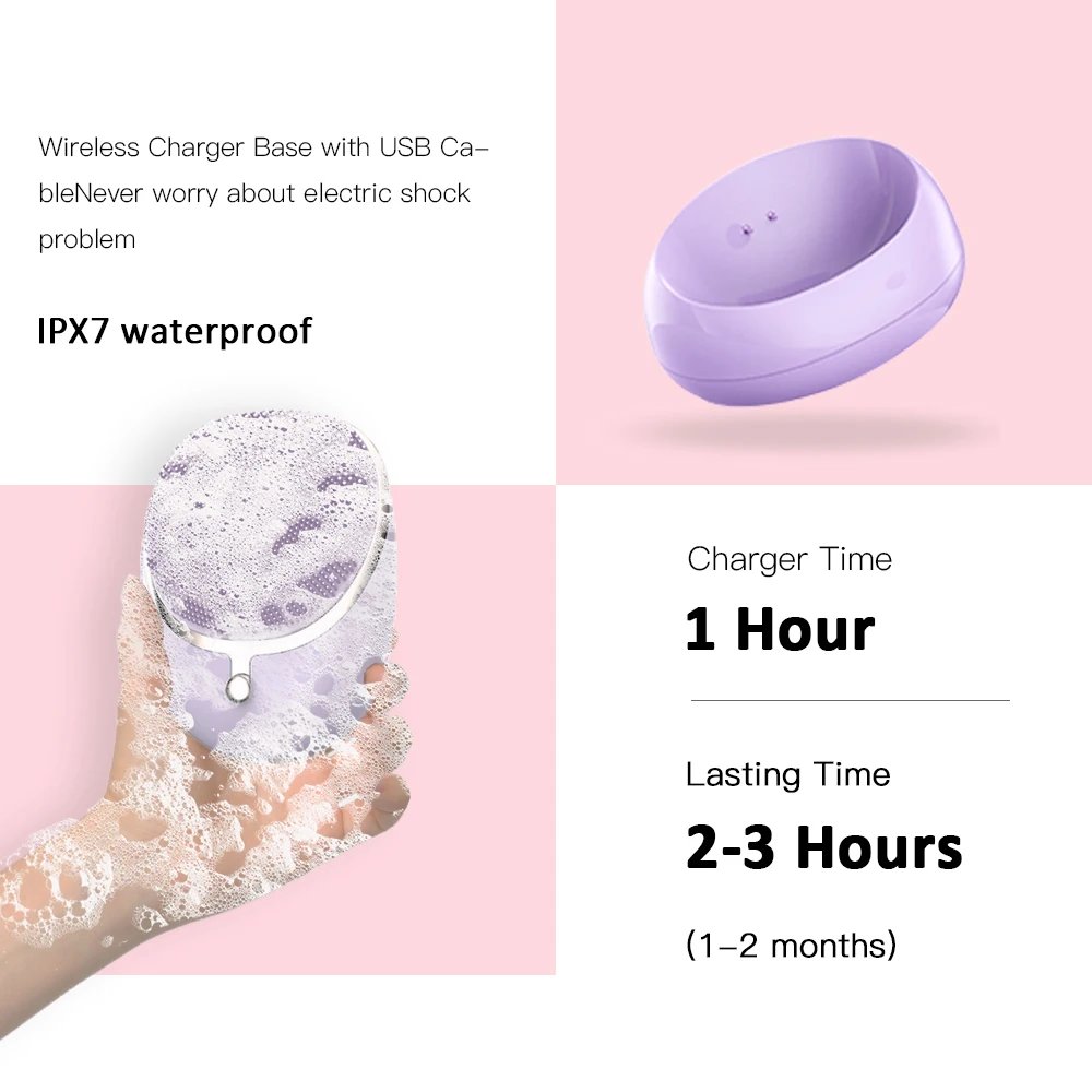 4: Wireless Charging & IPX7 Waterproof: FAST wireless charging 1 hours which will last 30 days. This Wireless Charging facial brush fits easily in a purse or handbag. Bring it to wherever your busy lifestyle takes you. This device is IPX7 watertightness, can be used in the washbasins, bathtubs and showers.