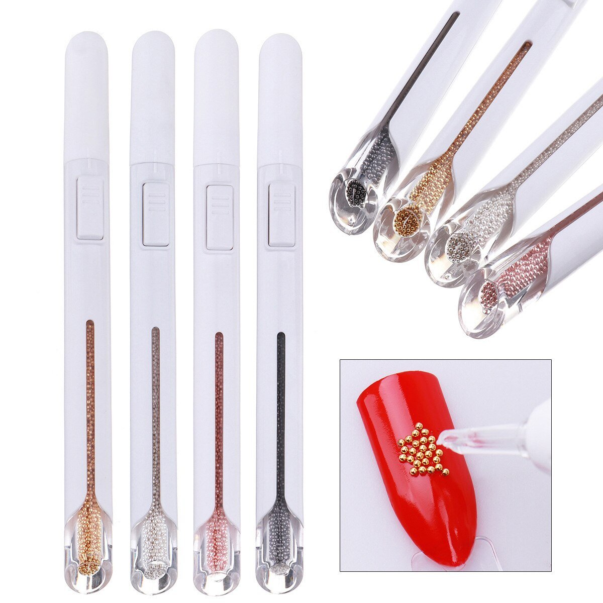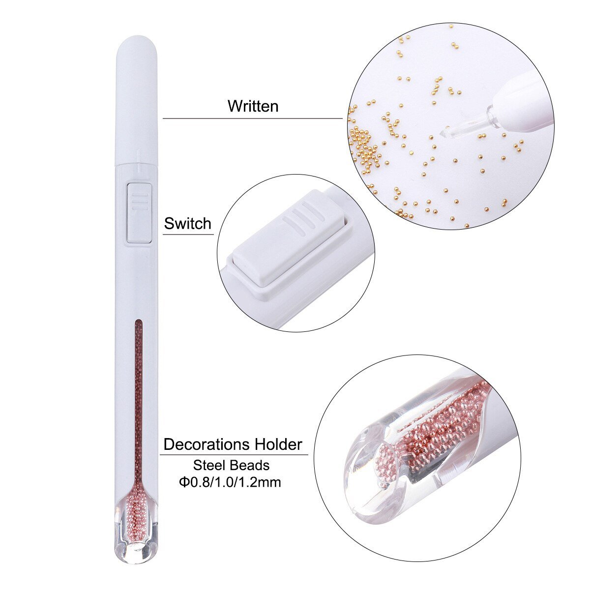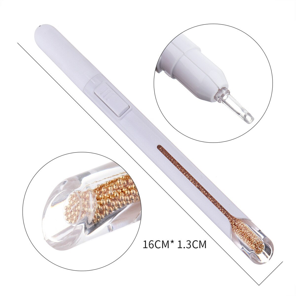 Add exquisite metal beads on your nail tips in record time with our Nail art pen. It is specially designed to create beautiful, sparkling polished nail tips effortlessly. This Nail art bullion pen is lightweight, durable, and easy to use. You just aim and press the button on the side and the metal beads will come out, place beads directly and accurately. It contains approximately 2800 metal beads inside, they are made of premium metal that’s non-corrosive and non-deforming, ensure long-lasting wear. Our pen is suitable for professional nail salons or DIY manicures at home. Also, it’s perfect for fine art, nail decorating, and manicure tool. What are you looking for? Buy now!